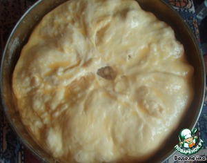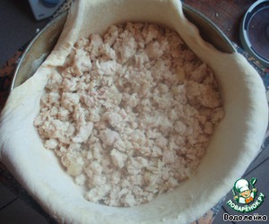 Теперь берем дрожжевое тесто (рецепт его приготовления не важен, можно приготовить по своему рецепту, можно купить в магазине или взять на сайте у поварят; я брала рецепт из своей книги рецептов для хлебопечки, за основу взяла рецепт простого белого хлеба, только ставила его на режим "тесто"). Раскатываем его по кругу и перекладываем в смазанную маслом форму так, чтобы края свисали.