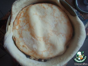 Сверху смородины - опять 3 блинчика. У меня блины были как раз по размеру моей разъемной формы. Если форма больше или блинчики меньше, то их может понадобиться большее количество. Тут главное блинчиками прикрыть предыдущий слой.