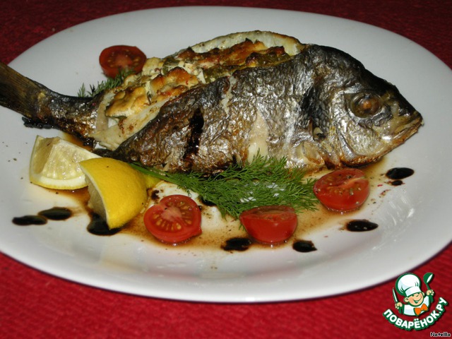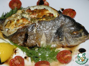 Положить рыбу на брюшко и через разрез на спинке нафаршировать получившейся смесью. Сбрызнуть соком лимона.