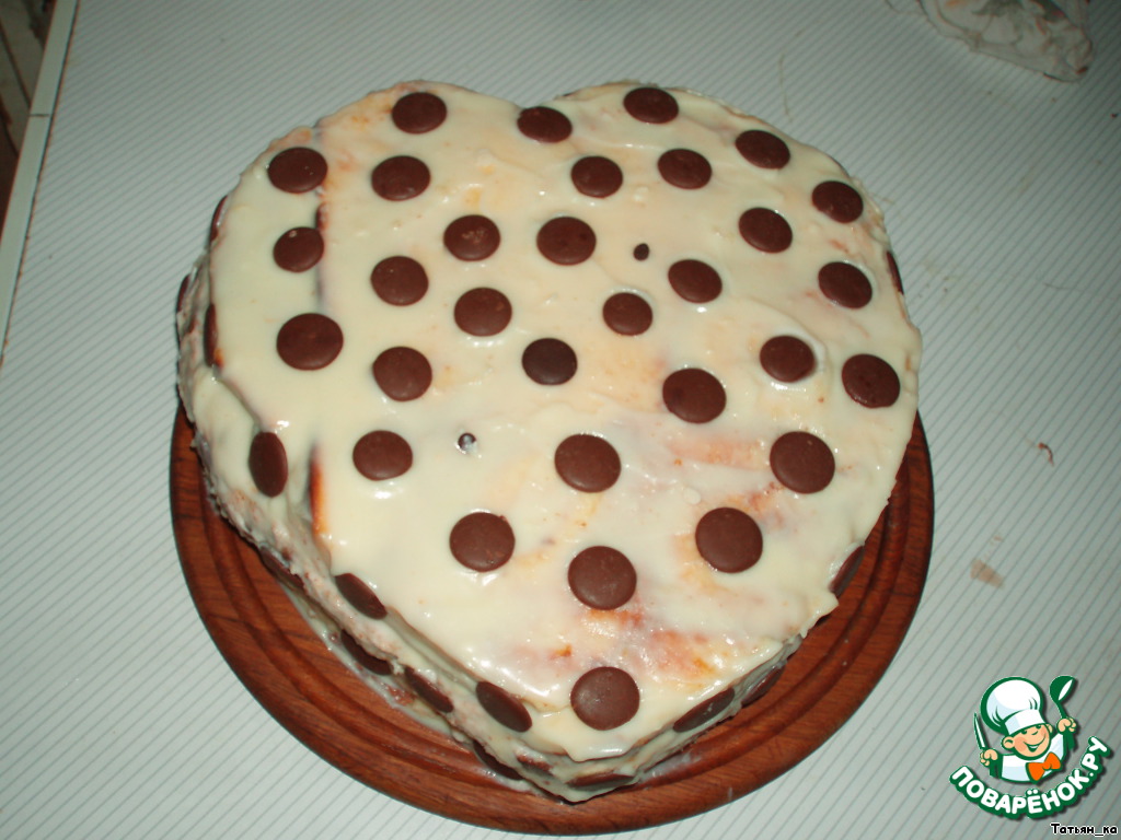 Я изначально хотела сделать торт в виде сердца, но т.к. моя "сердечная" форма слишком мала, мне пришлось выпекать коржи в обычной прямоугольной форме, а затем, с помощью шаблона, вырезать сердце. В связи с этим обстоятельством приготовление торта заняло больше времени, чем я планировала, потому что люблю безотходное производство, и идея пустить в дело остатки бисквитов, которые получились после вырезания сердца, пришла уже по ходу дела. Если вы имеете форму в виде сердца среднего или чуть больше среднего размера, у вас не останется никаких "отходов", и приготовление торта не займет много времени. -