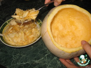 Срезаем у тыквы крышечку, вынимаем семечки и мякоть (отложить, она нам понадобится). Подчистить ложкой, оставить совсем немного на стенках