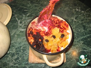 Снять с огня, добавить натёртые на тёрке свеклу и морковь, замоченный предварительно изюм, порезанные цукаты, соль, сахар