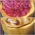 Всё сложить в тыкву, закрыть крышкой. Поставить в прогретую духовку. Готовить при t200* 30-40 мин., в зависимости от размера тыквы