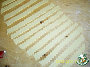 Теперь тот кусочек, который остался на доске, раскатываю тоненько и нарезаю на полоски.