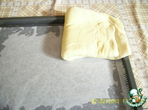 Складываю вчетверо получившуюся лепёшку для того, чтобы перенести её на противень.