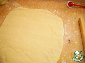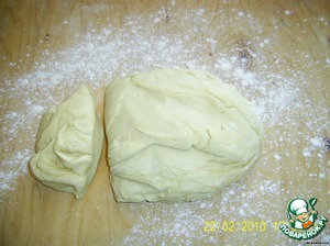 Ставлю духовку на разогрев 200 гр. Вынимаю тесто на разделочную доску, отрезаю кусочек для верха пирога.