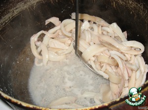 Теперь прогреваем наш казан и наливаем масла. Бросаем ленты кальмара. После этого кальмары дают сок. Нам не желательно, чтобы кальмары кипели в этом соке. Они должны жариться. Поэтому мы аккуратно шумовкой приподнимаем кальмаров и придавливаем их к стенке казана, прибавляем огонь и ждем, когда сок выпарится. Затем быстро, в течении 2 минут, обжариваем кальмары. Выкладываем их на тарелку.