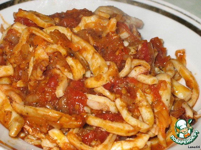 Тщательно перемешаем кальмары с соусом, потушим две-три минуты и снимем посуду с плиты.