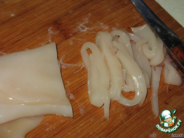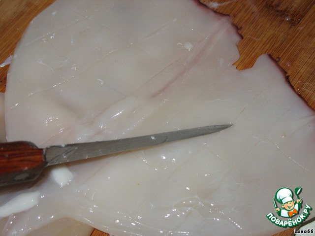Итак, очищенные и вымытые кальмары стряхнуть от лишней влаги. Чем меньше влаги, тем лучше для дальнейшей готовки. Разрезать каждую тушку с одной стороны вдоль, чтобы она раскрылась, как лист. На внутренней части тупой стороной ножа сделать сеточку. Это делается для того, чтобы в процессе жарки кусочки не заворачивались в кольца и лучше могли пропитаться ароматным соусом. -
