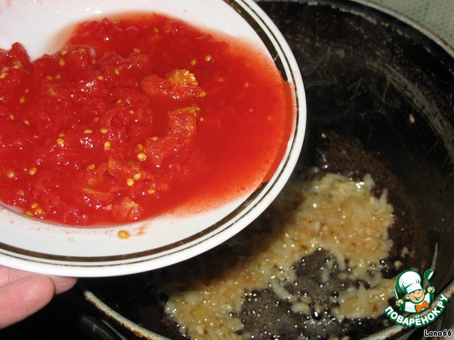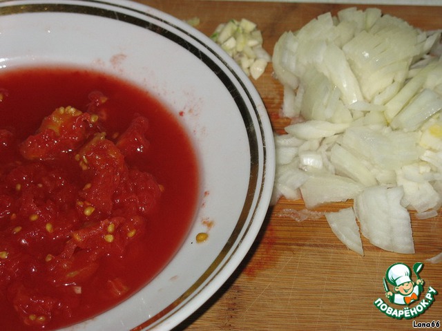 Теперь подготовим овощи. Помидоры ошпарим кипятком, очистим от кожицы и нарежем мелко. Лук нашинкуем мелко. Чеснок расплющим ножом и нарежем на кусочки.
