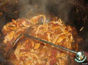 Я сделала проще, в овощную поджарку с соусом выложила кальмары и добавила приправы для креветок.