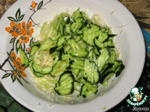 Огурец тонко порезать, положить в миску.