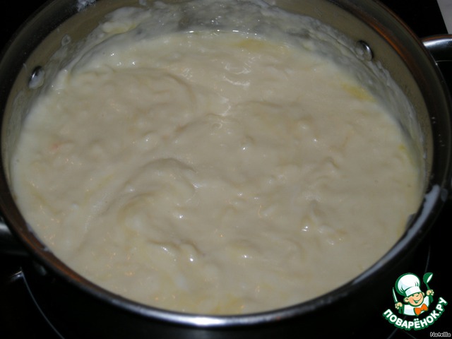 Осторожно влить молоко, довести до кипения, постоянно помешивая, пока смесь не загустеет.