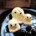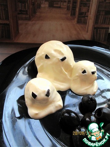 Из маслинки вырезаем малюсенькие кусочки, делаем привидениям глаза. Делать нужно более аккуратно, нежели у меня...