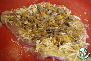 Выкладываем на сыр грибы с луком. Посыпаем оставшимся сыром.