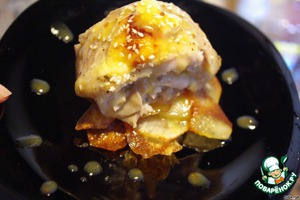 При подаче выкладываем на тарелку картофель, поливаем его соусом. Здесь желательно дать немного постоять картофелю (минутки 3), чтобы он немного пропитался соусом.