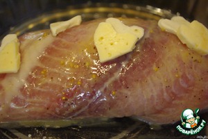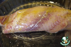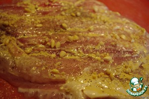 Итак, филе пангасиуса (у меня было не замороженное, а охлаждённое, замороженное - разморозить), разрезаем там, где это возможно (нужно судить по толщине и форме филе), вдоль, чтобы получился один общий пласт рыбы, который мы будем сворачивать в рулет. Смазываем его 1 чайной ложкой горчицы, солим и перчим по вкусу. Оставляем пропитаться минут на 10.