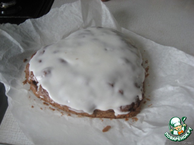Приготовить глазурь по инструкции на упаковке и полить тортик сверху.