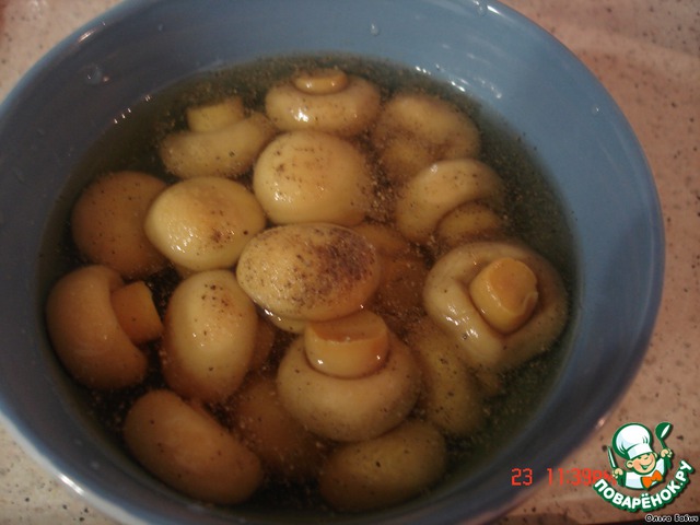 В грибы добавить специи, уксус бальзамический (желательно их сразу порезать пластинками).