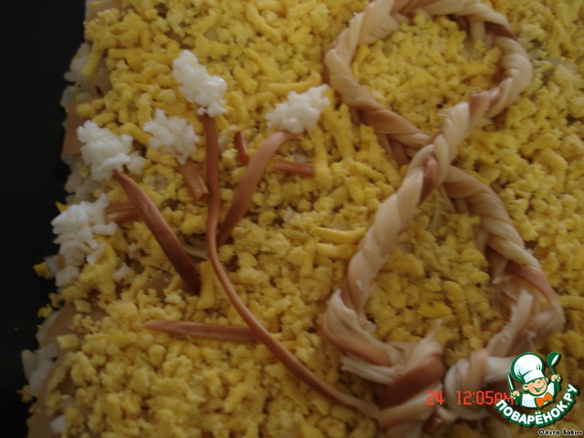 Присыпаем желтком и выкладываем "8", я сделала из сыра, просто сплела косичку из 5 жгутов, чтобы ее лучше было видно.
