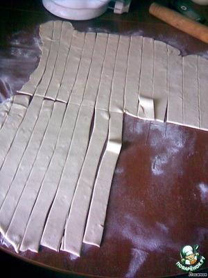 Оставшееся тесто порезать на тонкие полоски одинаковой ширины и длины.