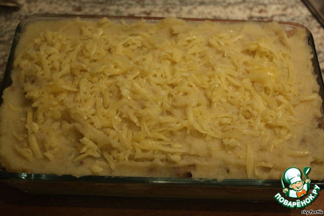 Сверху пюре и посыпаем оставшимся сыром