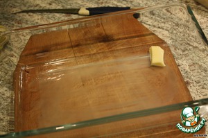 Берем форму (у меня, как видите, стеклянная), немного нагреваем и смазываем сливочным маслом