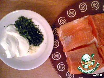 Филе форели нарезать большими плоскими квадратами размером 8-10 см, посолить, поперчить по вкусу. Чеснок мелко измельчить, накрошить зелень - все это смешать со сметаной, посолить.