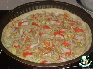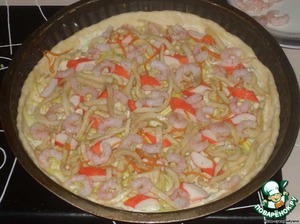 Люблю морепродукты... любые, кроме мидий... Особенно люблю креветки. Хотела на день рождения сделать заливные креветки, но не сложилось, а пачка креветок осталась лежать в морозилке. А тут зашла в супермаркет, а там презентация корейских салатов. О-о-о!!! Это я люблю!!! Только все уже перепробовано давно, ничего нового... и вдруг взгляд упал на кальмары... О! Вот, что мне надо! Купила. Иду и думаю, куда их забабахать? И тут приходит в голову идея сварганить пиццу с морепродуктами. Кальмары, креветки... Мало! Что еще? "Бог троицу любит!" Нужен третий продукт. Остановилась на крабовых палочках. Итак, вперед!!!