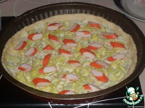 Выложить лук-порей и на него равномерно распределить крабовые палочки.
