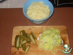 Лук-порей нарезать тонкими колечками. Корнишоны (кстати, можно обойтись и без них, у меня просто завалялись с дня рождения 5 штучек) разрезать вдоль, сыр натереть на крупной терке.