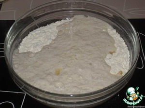 Влить подошедшую опару и замесить тесто. Накрыть его салфеткой и поставить в теплое место для подъема.