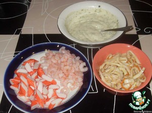 Креветки разморозить. Крабовые палочки нарезать ромбиками. Подготовить кальмары и соус.