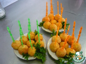 7. Готовые крокеты выложите на блюдце, воткните по шпажке в каждый из них.