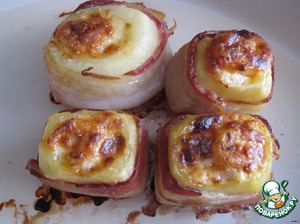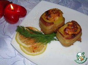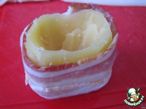 В картофеле делаем ножом выемку. Оборачиваем картофель беконом. Скрепляем зубочисткой.