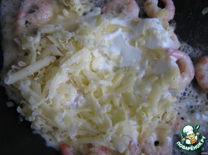 Поджариваем креветки 1 минуту. Добавляем сливки, вино, сыр и тушим пару минут.