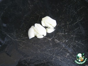 На раскалённой сковороде на масле поджариваем раздавленный чеснок.