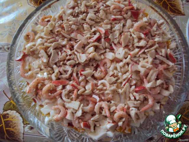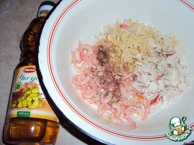 Креветки ошпарить кипятком, очистить, крабовое мясо порубить, добавить сухую горчицу, по щепотке чёрного молотого перца и соли, винный уксус и оливковое масло.