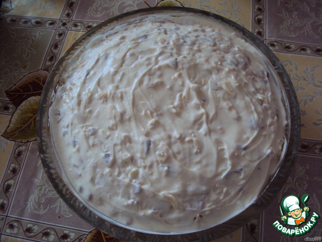 Промазать майонезом, сверху посыпать порезанным маринованным болгарским перчиком. Если у вас нет маринованного перца, то можно взять свежий.