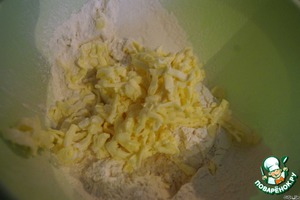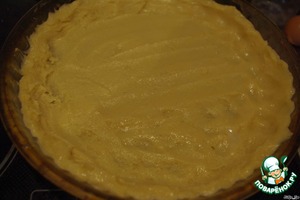 Тесто выкладываем в форму, смазанную маслом. Формируем бортики. Тесто получается мягкое, немного липнущее к сухим рукам, чтобы не липло, смочить руки холодной водой. Ставим в, разогретую до 190 градусов, духовку, на 15 минут.
