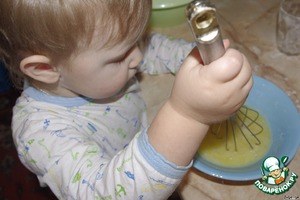 В яйцо добавить половину сахара и ванильный сахар. Взбить венчиком. У меня Мишка этим занимался.