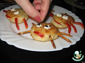 Украшаем наших паучков: ротики и лапки из красного сладкого перца. Половинку лапок сделала из солёной соломки. Доченька не кушает перец, а вот соломку умяла с великим удовольствием.