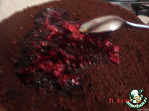 Разрезать по горизонтали и пропитать малиновым сиропом с коньяком, накрыть 2-м коржом.