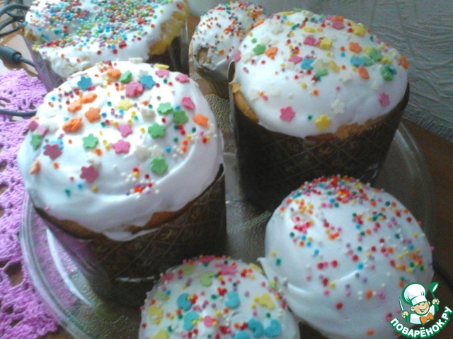 ГОТОВНОСТЬ ПРОВЕРЯЙТЕ ДЕРЕВЯНОЙ ЛУЧИНКОЙ. Oхлаждайте кулич на боку, катая его сбоку на бок изредка. Остывший кулич смазать белковой глазурью и украсить на свой вкус и упаковать в п/э пакет до глазури.