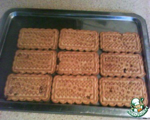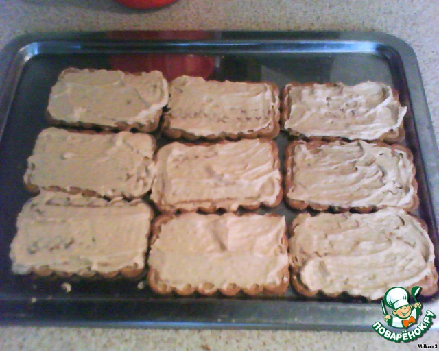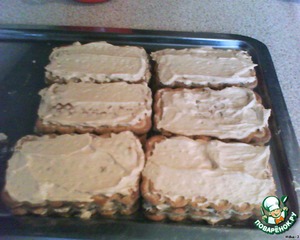 Печенье выложить друг на друга в три слоя и каждый ряд смазать кремом.