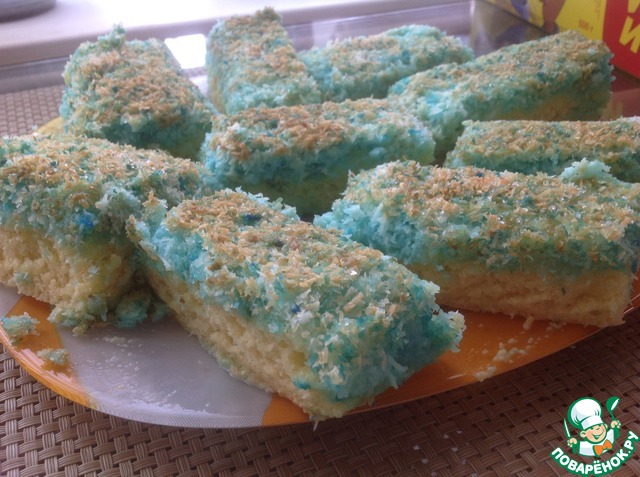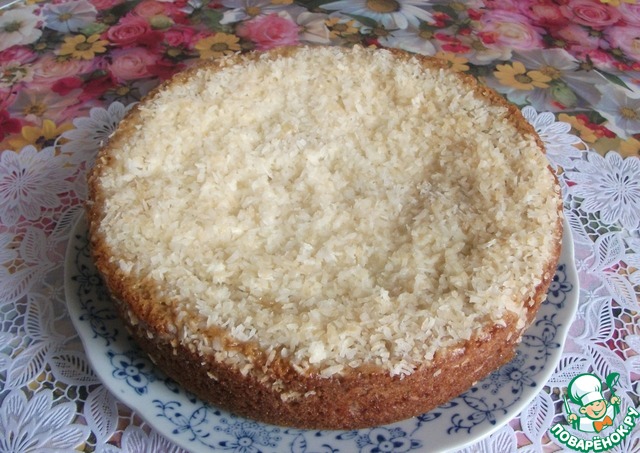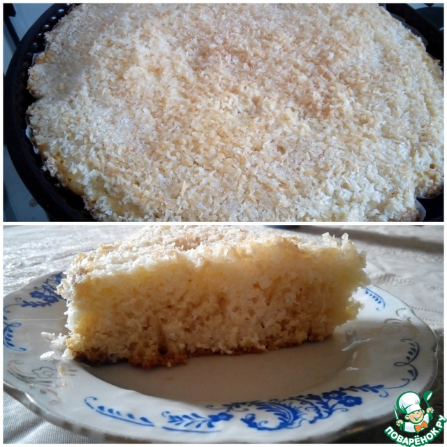Сверху тесто равномерно посыпаем кокосовой посыпкой и ставим в нагретую до 180-200 градусов духовку на 25-30 мин. Девочки, я пекла
