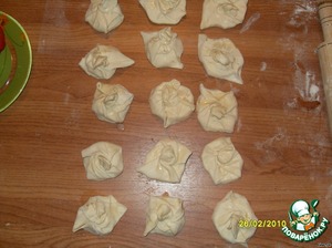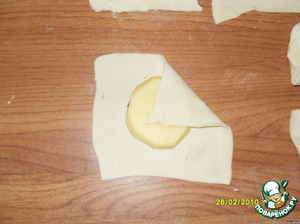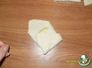 Берем 1 квадрат готового слоеного теста, раскатываем его в токий пласт, режем квадратами.