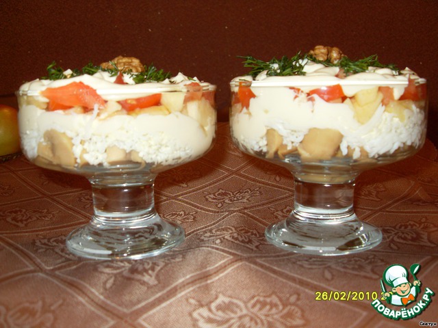 Очень вкусный слоеный салатик. На мой взгляд, в нем очень хорошо сочетаются ингредиенты. Попробуйте приготовить его на романтический вечер или просто так, я думаю, ваша вторая половинка или друзья оценят этот салатик по достоинству.
