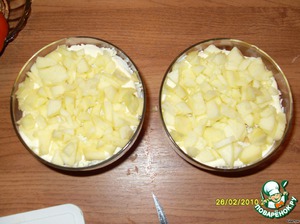 Почистить и нарезать кубиками яблоко, уложить на яйцо 3 слоем.