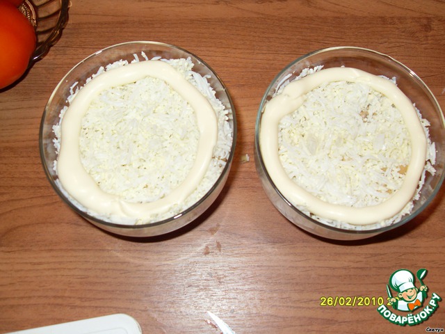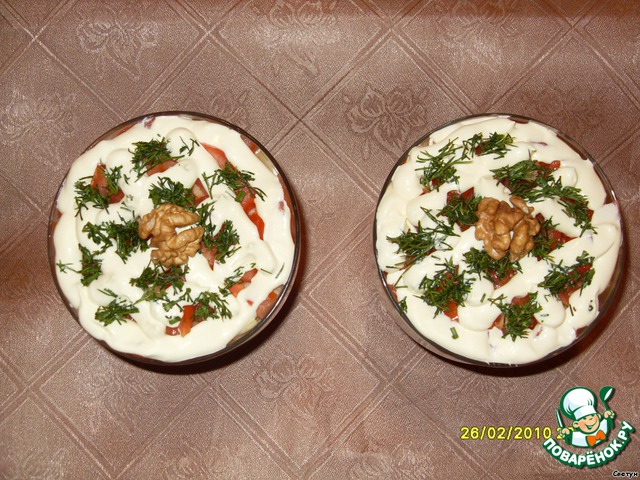 Сделать из майонеза сеточку и украсить зеленью или по своему вкусу (я еще положила кусочек грецкого ореха).